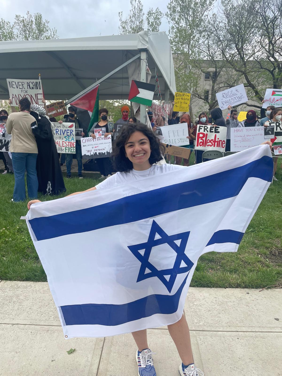KU graduate Rachel Kricsfeld holding an Israeli flag outside of a Students for Justice in Palestine encampment on campus.