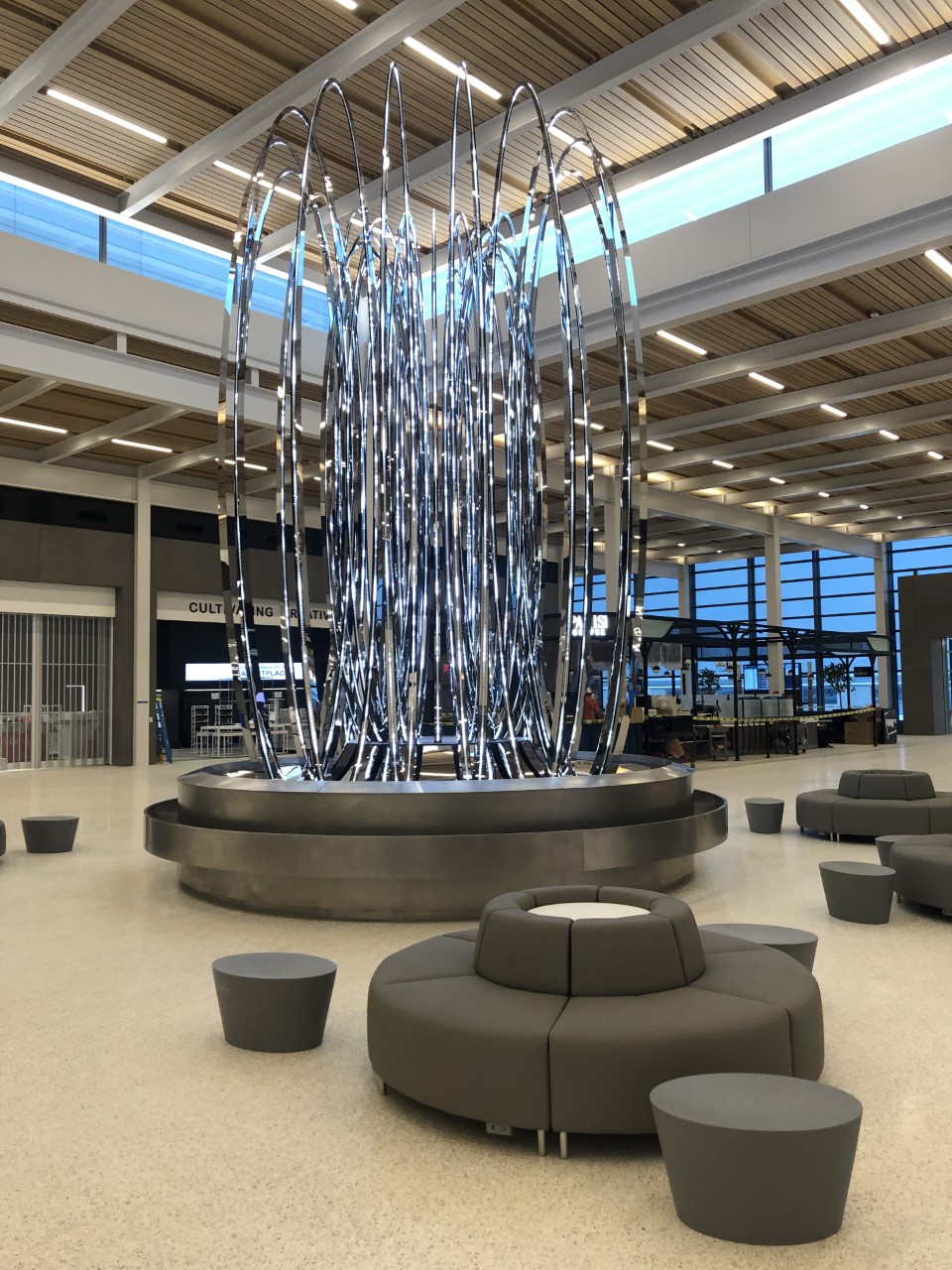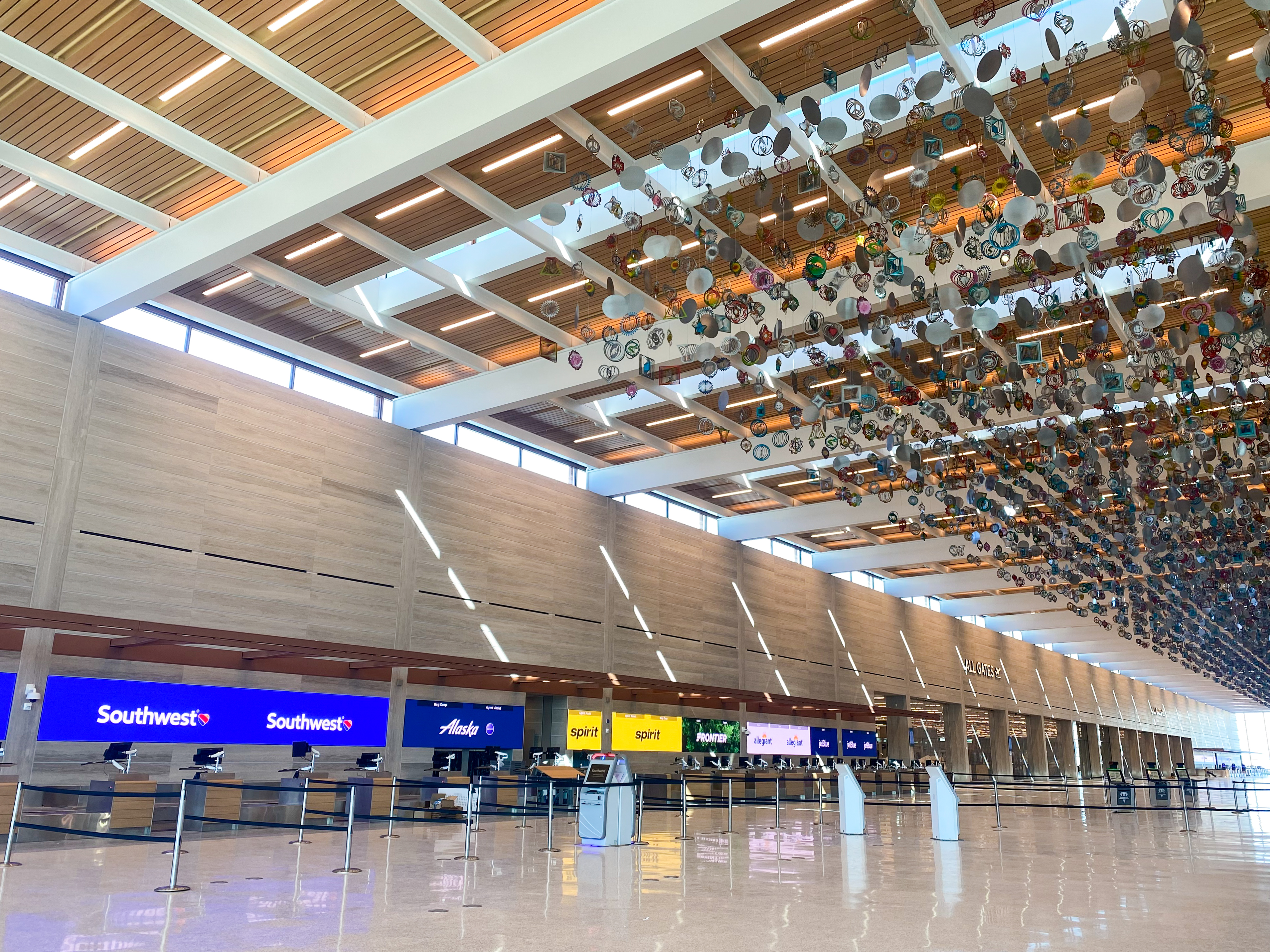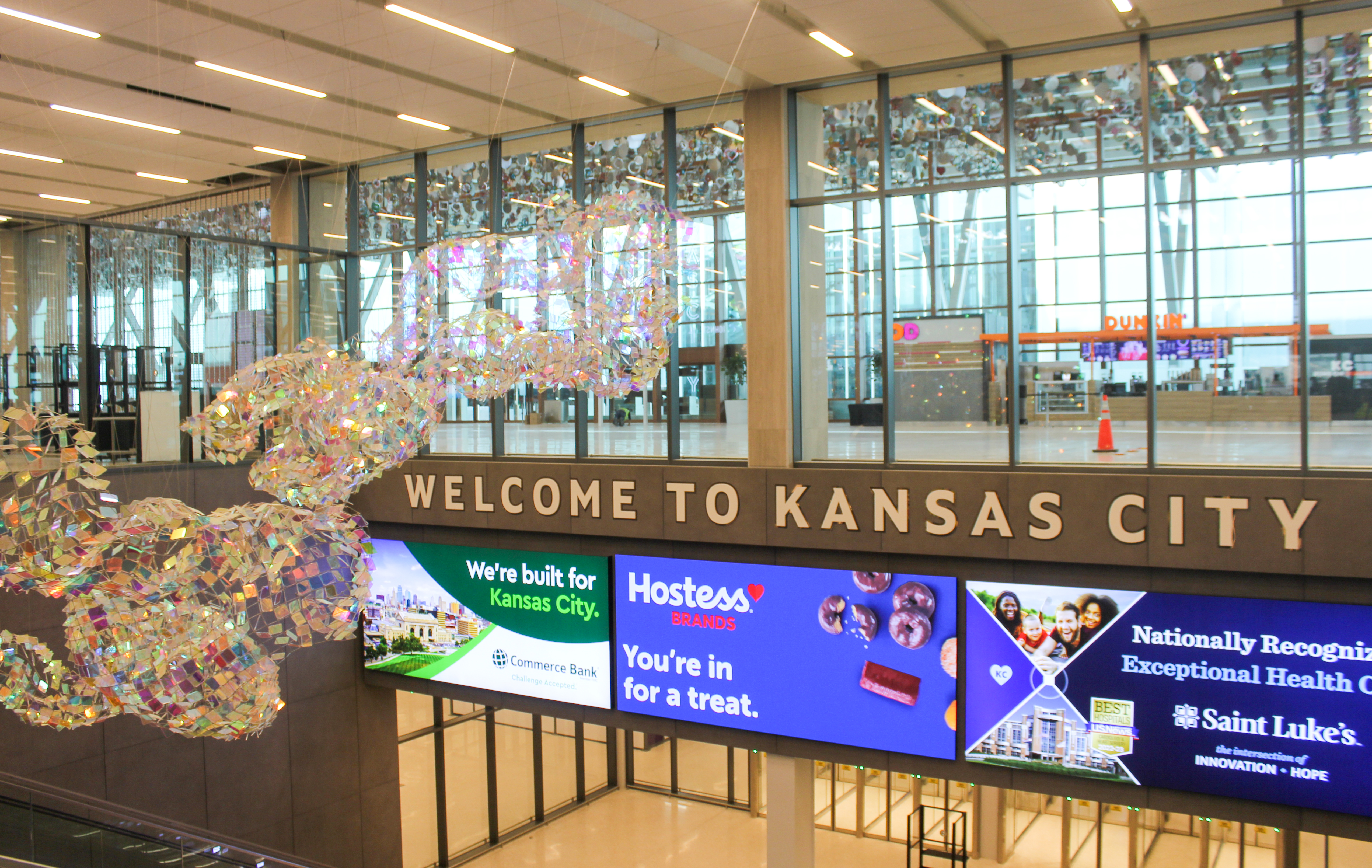 The spaciousness isn’t the only thing travelers will notice. The terminal contains the largest public art program in Kansas City's history, with 28 unique art installations. Starting with “The Air Up There” by artist Nick Cave — an installation of more than 3,000 strands of spinners that hang overhead in the check-in area — it seems as if almost everywhere you look, there’s another piece of art to enjoy.