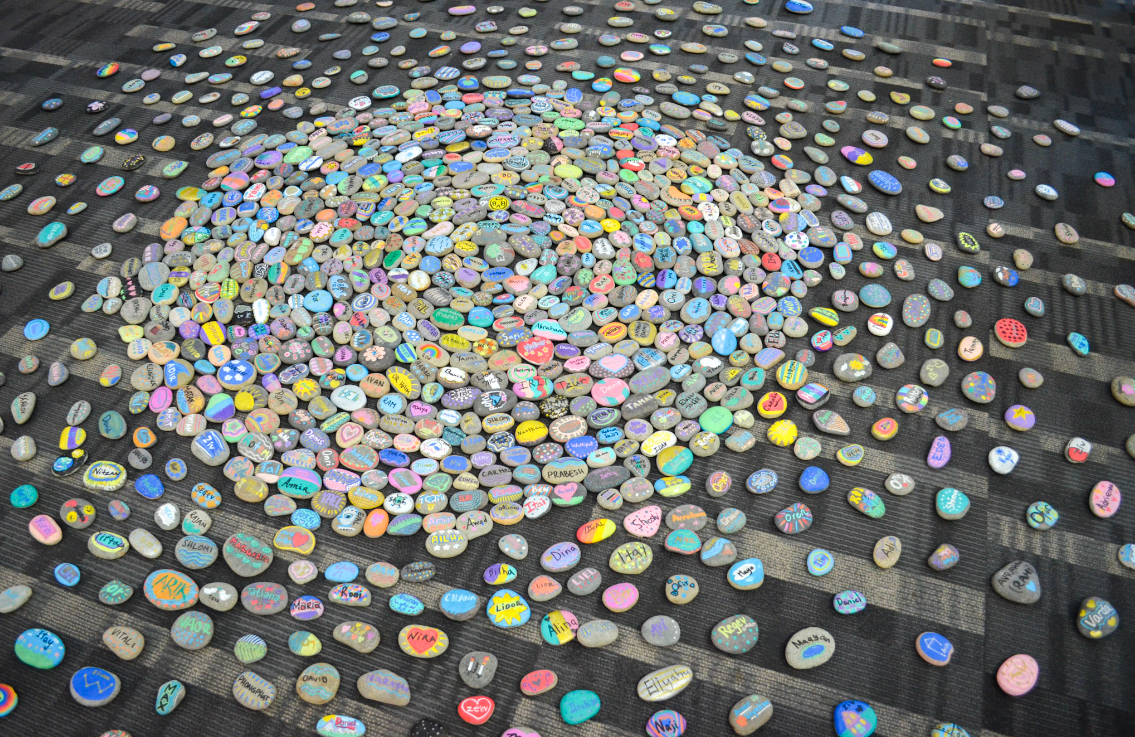 Dozens of staff from organizations located at the Jewish Community Campus and Jewish students at HBHA and the University of Kansas helped paint hundreds of the memorial stones. Attendees of the installation’s opening had the opportunity to paint a rock to help complete the artwork.