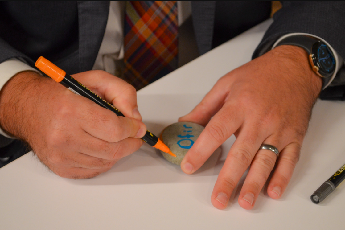 An attendee of the art installation’s debut writes the name of a victim of the Oct. 7 attacks on a stone to be added to the artwork. (Rachel Kaseff)
