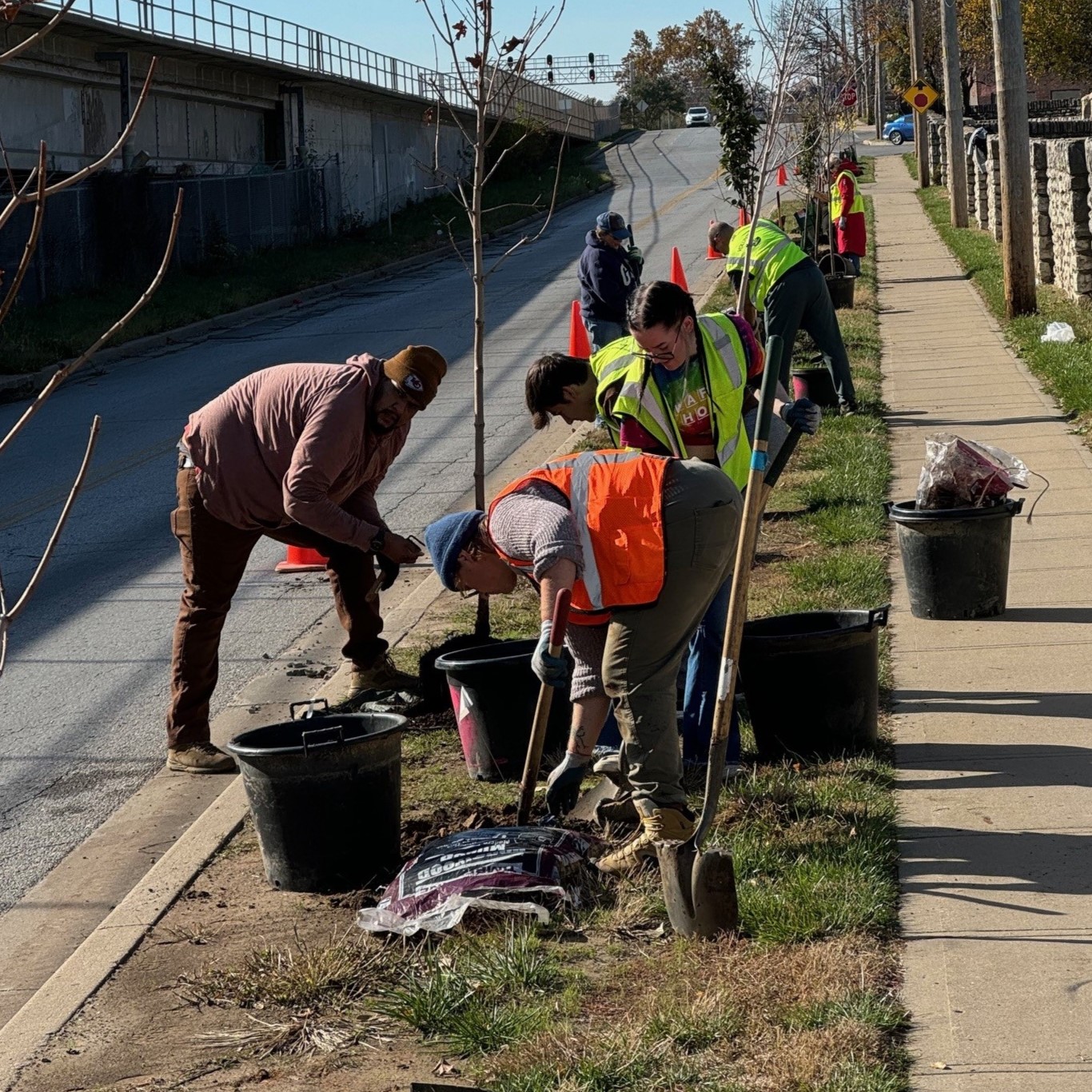 In late November, a squad of about 18 volunteers from Bridging the Gap fanned out along Wilson Avenue and Belmont Boulevard on the northern fringe of Kansas City to plant 31 trees on the public right-of-way adjacent to Congregation Beth Israel Abraham and Voliner’s Sheffield Cemetery.